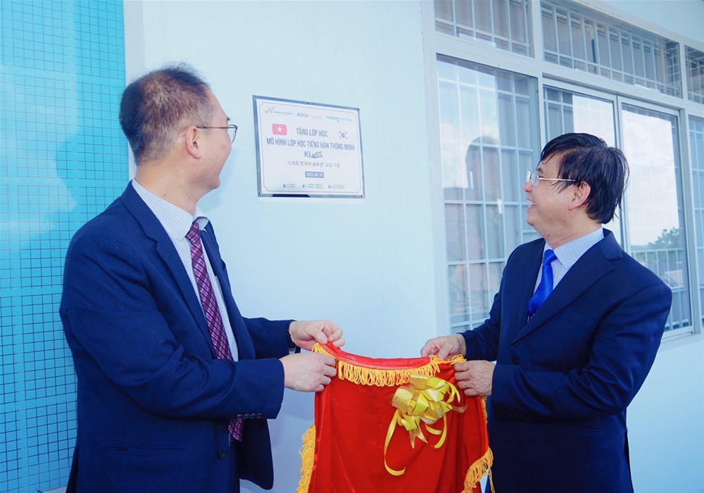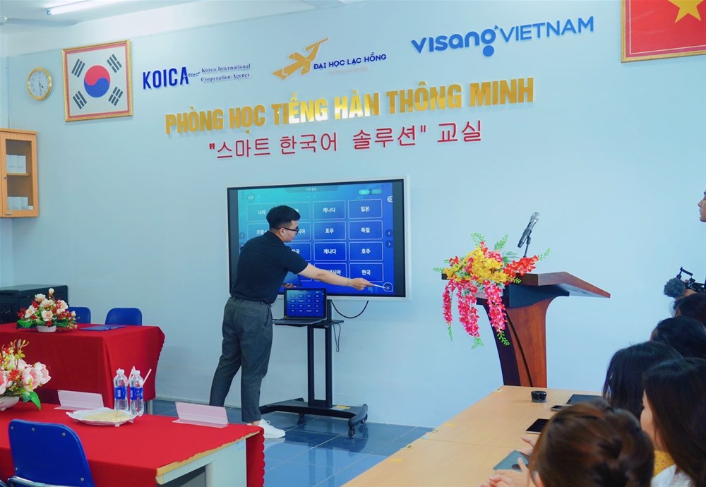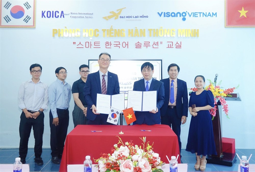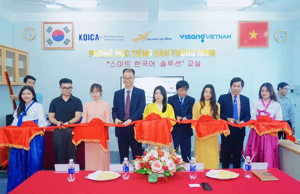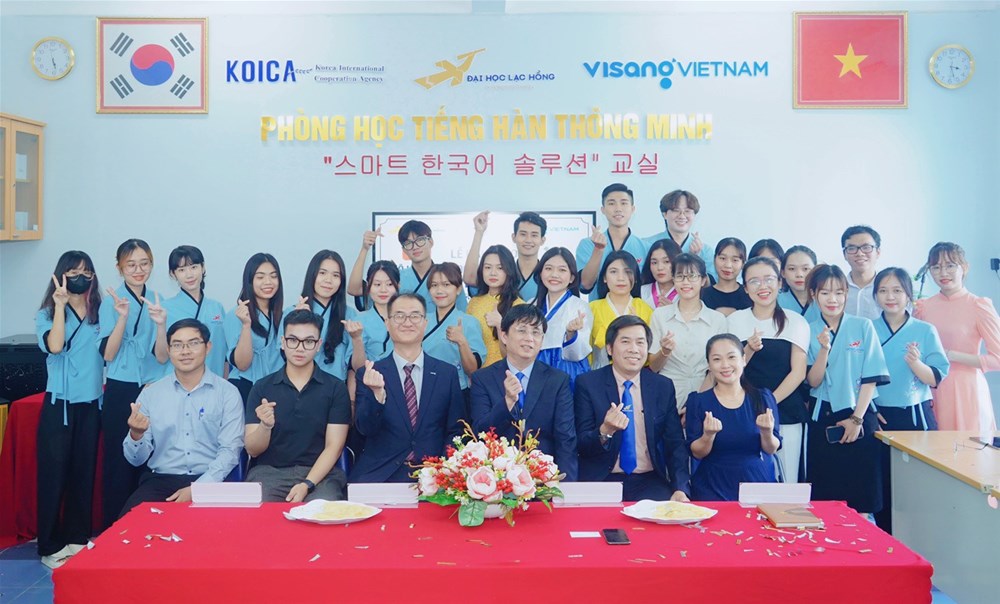 Hôm nay, ngày 15/6/2023, tại phòng E305, cơ sở 3, trường ĐH Lạc Hồng, Ngành Hàn Quốc học đã long trọng tổ chức buổi bàn giao thiết bị - ký kết - khai trương phòng học thông minh do tập đoàn Visang Education tài trợ. Tại buổi lễ bàn giao lần này, đại diện phía ĐH Lạc Hồng là TS. Lâm Thành Hiển, Hiệu trưởng Nhà trường đã cùng ngài Lee Yeong Geun – Tổng giám đốc Visang Việt Nam đặt bút ký vào Biên bản bàn giao thiết bị, cắt băng khai trương phòng học thông minh KLASS. Ngài Lee Yeong Geun cũng cho biết thêm: “Với thế mạnh về lĩnh vực công nghệ giáo dục, cùng với những kinh nghiệm và kỹ thuật hiện có, chúng tôi mong rằng có thể giúp sinh viên ĐH Lạc Hồng nâng cao trải nghiệm học tập, từ đó cải thiện kỹ năng ngoại ngữ của mình. Visang cũng hy vọng sẽ cùng ĐH Lạc Hồng tìm ra những phương pháp học tập tiếng Hàn thú vị hơn cho sinh viên, xa hơn là góp phần thúc đẩy mối quan hệ hợp tác Việt Nam – Hàn Quốc”.