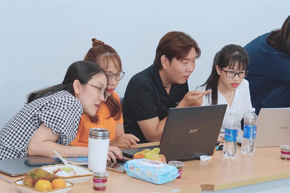 Ông Juong Hyon Kang, Giám đốc điều hành của Công ty ARASOLF và chị Trương Thị Trà Mi hướng dẫn các thao viết sách điện tử trên phần nềm Namo Author đến giảng viên Khoa Đông phương học