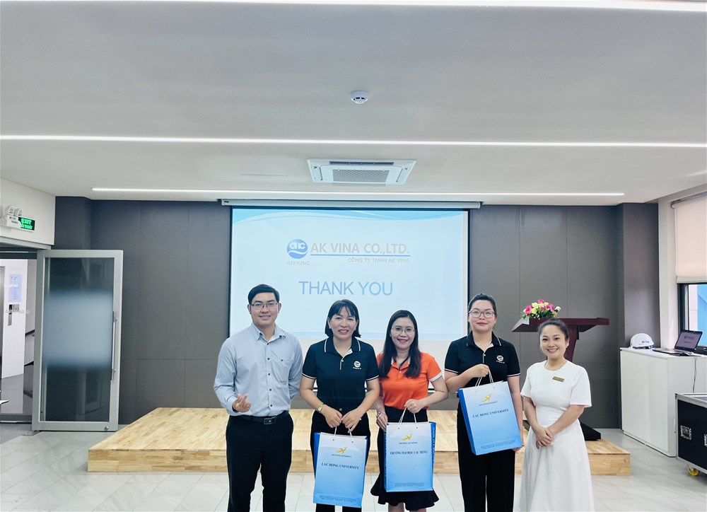 Tại buổi tham quan, Lãnh đạo Công Ty TNHH AK VINA đã có buổi nói chuyện thân mật với các bạn sinh viên ngành Hàn Quốc học. Ngoài những giới thiệu sơ lược về quá trình hình thành và phát triển của doanh nghiệp, Lãnh đạo công ty còn cho biết, hiện tại công ty đang có nhu cầu tuyển dụng rất nhiều nhân sự biết tiếng Hàn, đồng thời bày tỏ mong muốn sinh viên ngành Hàn Quốc học, Đại học Lạc Hồng nộp hồ sơ xin việc, Lãnh đạo công ty đánh giá rất cao năng lực tiếng Hàn của sinh viên Lạc Hồng.