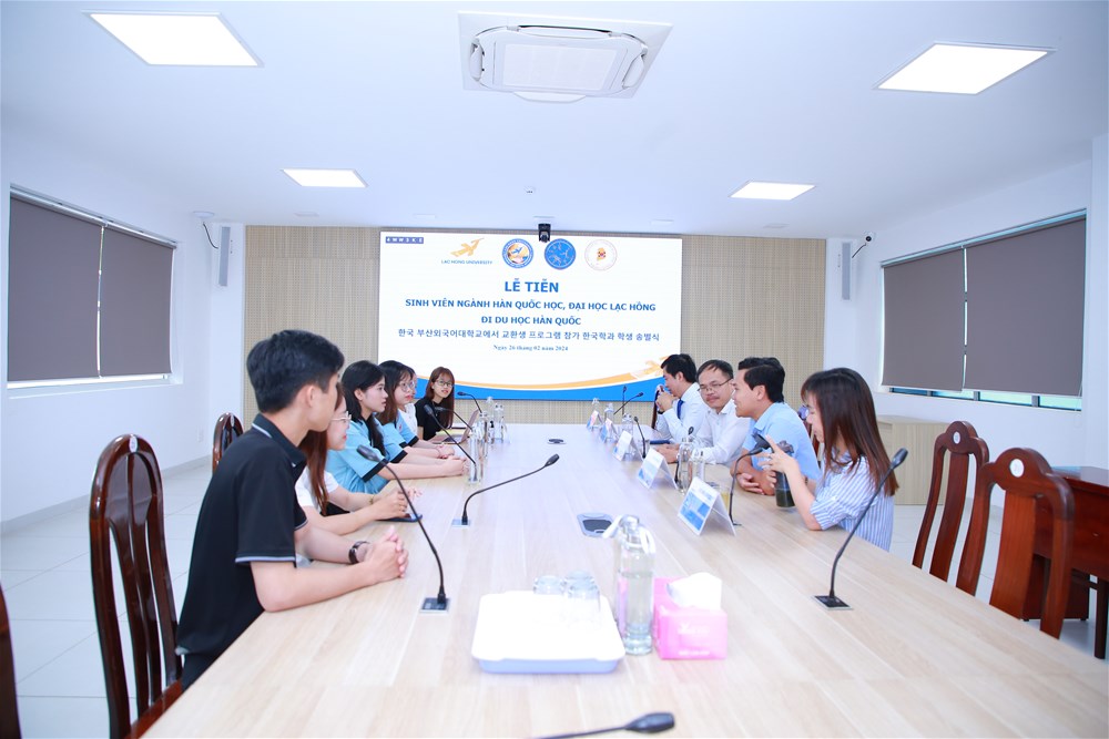 Vào sáng ngày 26/02/2024 tại Phòng họp Cơ sở 1 Trường Đại học Lạc Hồng, Ngành Hàn Quốc học đã tổ chức buổi lễ tiễn 2 bạn sinh viên là Nguyễn Hồng Khánh và Lương Ngọc Phương Uyên đi du học trao đổi tại ĐH Ngoại ngữ Busan Hàn Quốc.