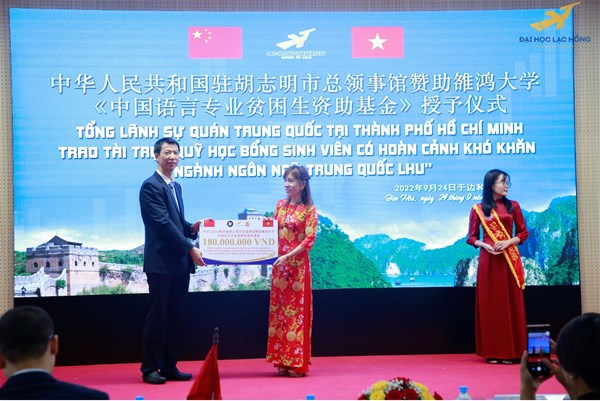 Đồng thời tại buổi lễ Tổng Lãnh Sự quán nước Cộng Hòa Nhân Dân Trung Hoa tại TP. Hồ Chí Minh còn trao tặng 180,000,000 VND (một trăm tám mươi triệu đồng) cho “Quỹ học bổng sinh viên có hoàn cảnh khó khăn ngành Ngôn ngữ Trung Quốc LHU”.
