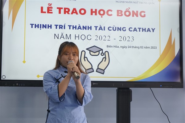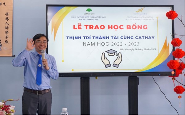 Trong buổi lễ, ThS. Phan Thế Anh - Trưởng ngành Ngôn ngữ Trung Quốc đã phát biểu gởi lời cảm ơn đến Công ty TNHH Bảo hiểm Nhân thọ Cathay (Việt Nam) đã tặng 50 triệu cho Quỹ học bổng cho các em sinh viên có hoàn cảnh khó khăn và cũng nhắn nhũ đến sinh viên phải cố gắng học tập để không phụ lòng quý doanh nghiệp đã tài trợ quỹ học bổng. Ông Cheng Fu Ho – Giám đốc công ty cũng có đôi lời phát biểu; và Bà Lỷ Lục Mùi: Phó giám đốc văn phòng kinh doanh đã giớ thiệu về công ty.