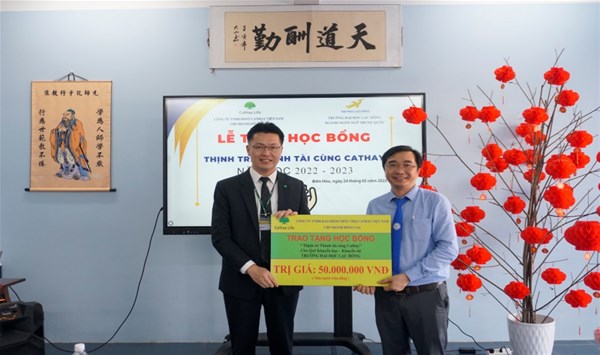 Nhằm tạo điều kiện cho các em sinh viên có hoàn cảnh khó khăn có thể tiếp tục việc học tập vào ngày 24/02/2023 lúc 13 giờ 30 Công ty TNHH Bảo hiểm Nhân thọ Cathay (Việt Nam) đã trao học bổng 50 triệu đồng chia làm 10 suất mỗi suất 10 triệu đồng cho 10 em sinh viên có hoàn cảnh khó khăn tại Phòng học Đa phương tiện cơ sở 3 – Đại học Lạc Hồng.