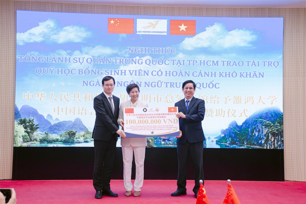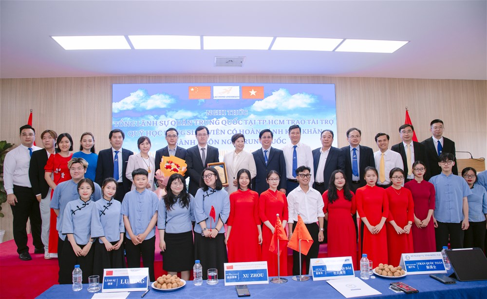 Trong chuyến thăm và làm việc lần này, đại diện Tổng Lãnh sự quán nước Cộng hòa Nhân dân Trung Hoa tại TP. Hồ Chí Minh trao tặng 100,000,000 VND (một trăm triệu đồng) cho “Quỹ học bổng sinh viên có hoàn cảnh khó khăn ngành Ngôn ngữ Trung Quốc LHU”.