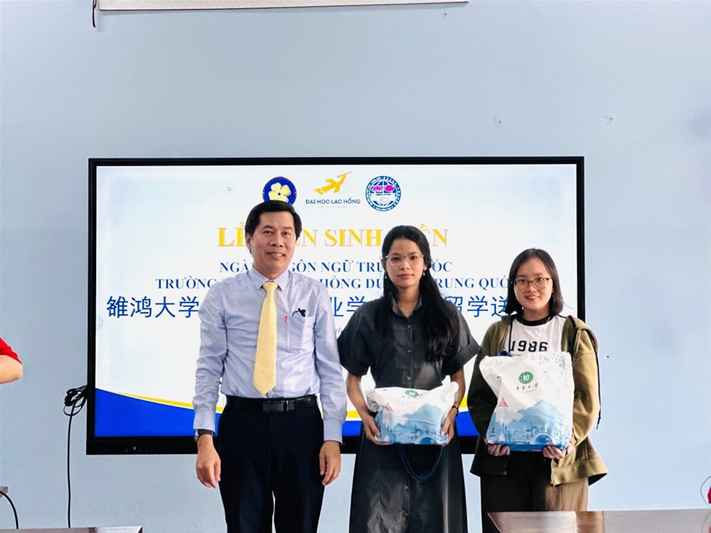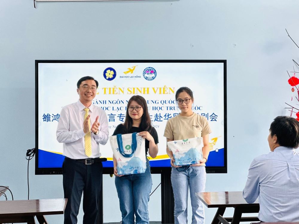 ThS. Phan Thế Anh - Trưởng ngành Ngôn ngữ Trung Quốc trao quà cho sinh viên Nguyễn Thị Phương Uyên và sinh viên Trần Thị Anh Thư  (sinh viên đi du học theo chương trình 3+2 tại trường đại học Lỗ Đông Trung Quốc)