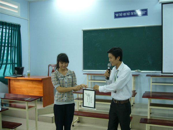 Đại diện lớp 09VN111 tặng quà cho lớp trưởng 10VN111 (ảnh trái) |