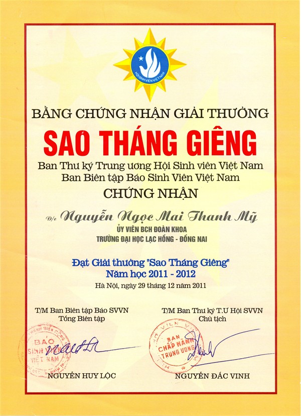 đã vinh dự được nhận Giải thưởng cao quý Sao Tháng giêng năm học 2011 - 2012 do Trung ương Hội Sinh viên Việt Nam trao tặng