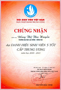 đã vinh dự được Ban Chấp hành Trung ương Hội Sinh viên Việt Nam trao tặng danh hiệu "Sinh viên 5 tốt" cấp Trung ương năm học 2010 - 2011.