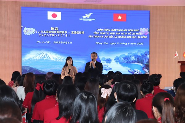 Sáng ngày 05/5/2022, Trường Đại học Lạc Hồng đã vinh dự đón tiếp ngài Watanabe Nobuhiro - Tổng Lãnh sự Nhật Bản tại Thành phố Hồ Chí Minh đến thăm và làm việc. Chuyến thăm nhằm thắt chặt hơn nữa mối quan hệ giữa Trường Đại học Lạc Hồng với cộng đồng doanh nghiệp Nhật Bản cũng như thúc đẩy các hoạt động giao lưu, kết nối trong thời gian tới.