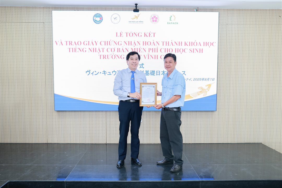 Sáng 07/08/2025, tại cơ sở 1 Trường Đại học Lạc Hồng, ngành Nhật Bản học đã tổ chức Lễ trao giấy chứng nhận hoàn thành khóa học tiếng Nhật cơ bản dành cho học sinh trường THPT Vĩnh Cửu kéo dài 2 tháng (06–07/2025)