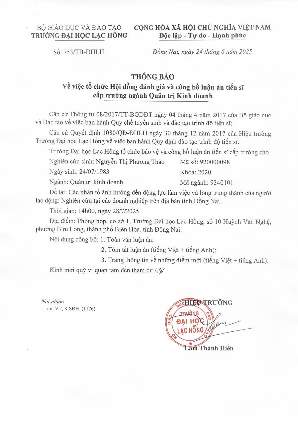 Thông báo lịch bảo vệ luận án tiến sĩ cấp Trường ngành Quản trị kinh doanh tháng 07 năm 2025